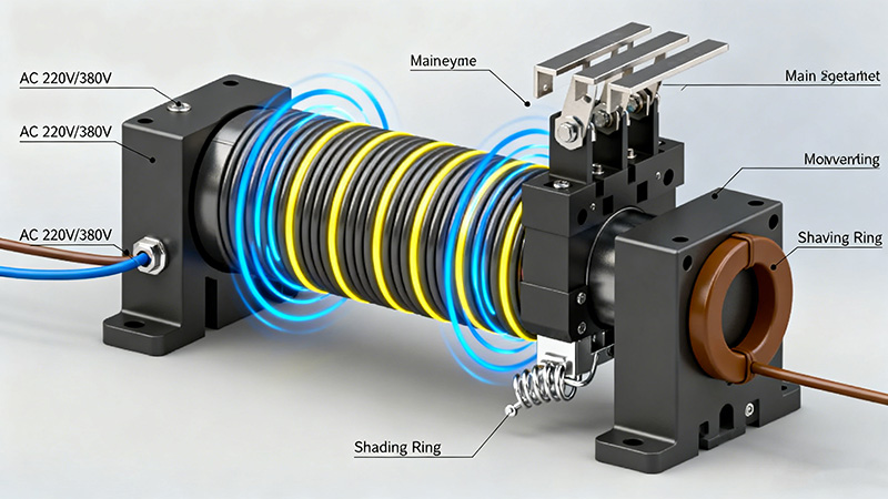 When energized, the alternating current generates an alternating magnetic field. This attracts the moving core to the fixed core, closing the main contacts and energizing the load. When de-energized, a return spring separates the cores to disconnect the load.
