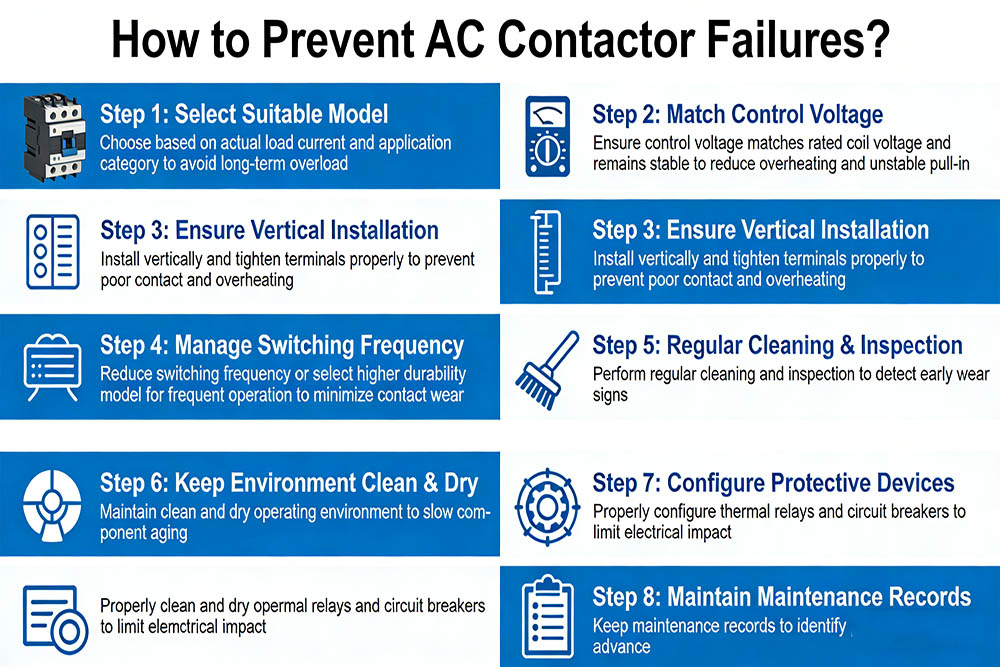 When the contactor rating does not match the actual load, contacts operate under higher stress, which increases heat and arc damage. Long term overload or frequent starting can shorten service life and increase the risk of contact welding or coil overheating.