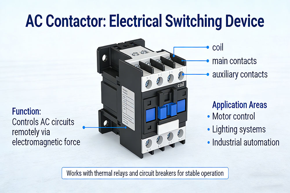 An AC contactor is an electrical switching device that is used to control the opening and closing of AC circuits from a distance, and it is widely applied in motor control, lighting systems, and industrial automation.