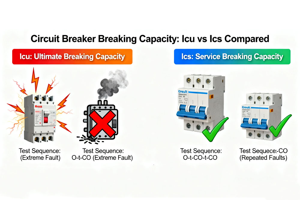 This comparison shows that Icu ensures survival in extreme fault scenarios. Ics ensures resilience and longer service life under repeated fault conditions. Choosing a breaker solely for Icu without regard to Ics may lead to forced replacement or unsafe operation after a fault.