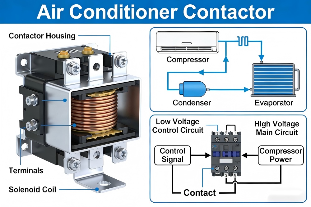 An AC contactor is a critical component in air conditioning systems. It controls the high voltage power supplied to key parts such as the compressor and condenser fan motor. Using a low voltage signal from the thermostat, it safely switches high current loads to ensure reliable cooling operation.